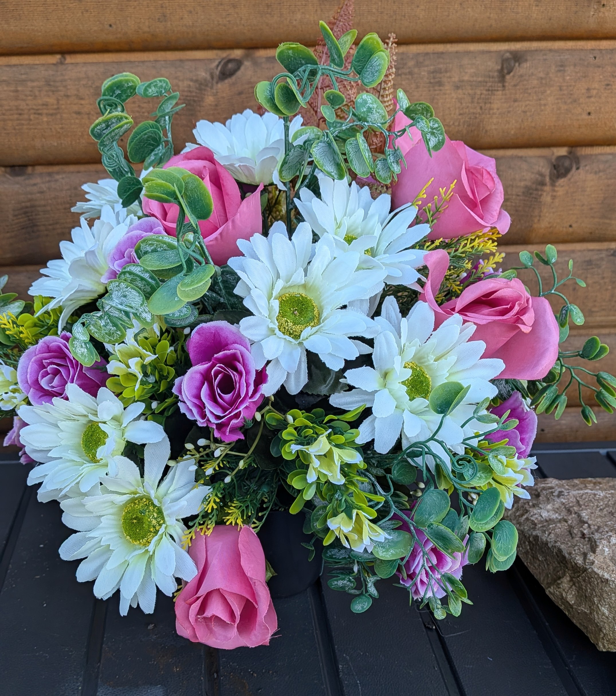 Flowers are set in a black grave pot that can be placed into grave surround or into a named pot . Flowers are all forward facing